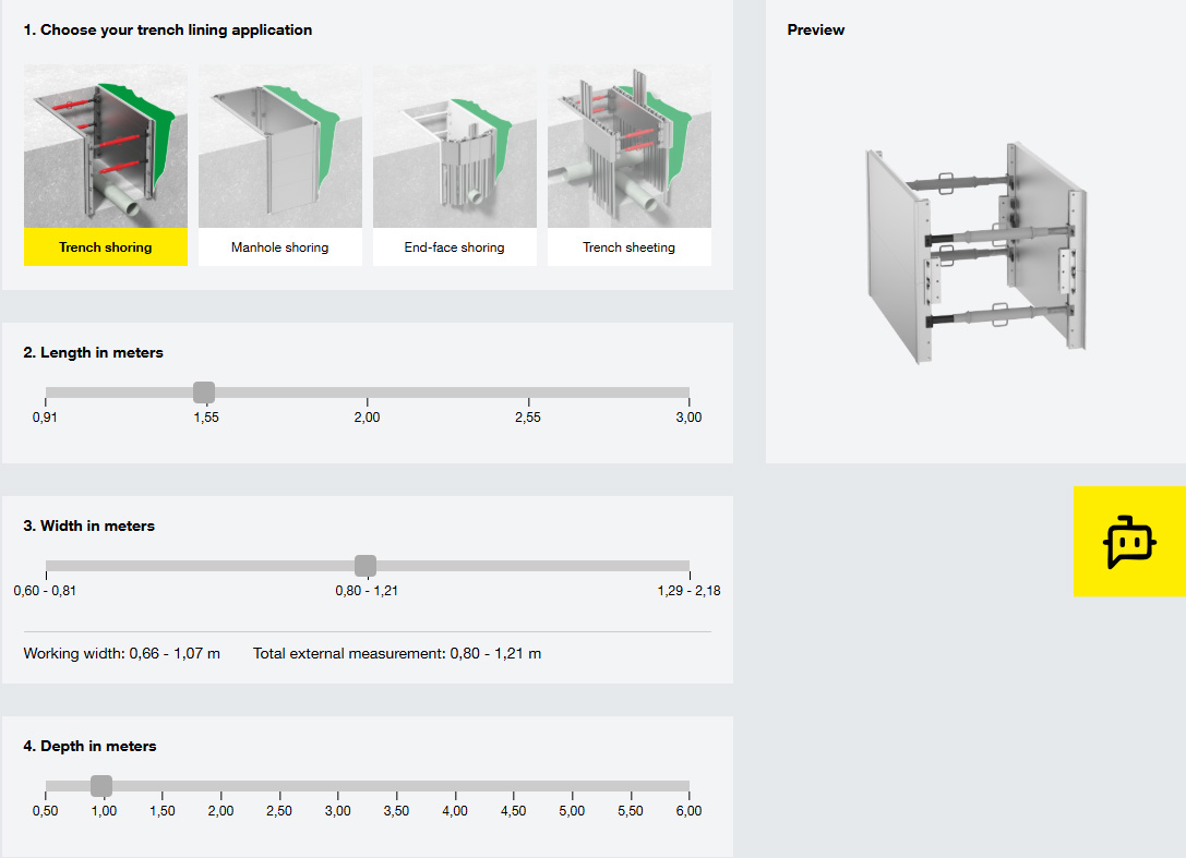 With our new trench lining configurator, you can create a precise configuration for your shoring situation in just a few steps: